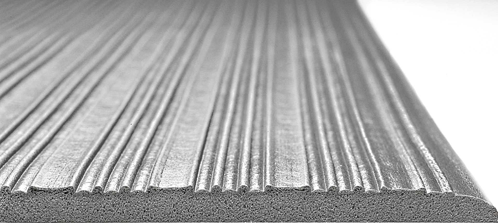 aus PVC mit geriffelter Oberfläche für maximale Rutschfestigkeit (R11 DIN 51130), ergonomisch, trittschall- und stoßdämmend, abgeschrägte Ränder verringern die Stolpergefahr, gut zu reinigen, isoliert gegen kalte Böden, einfach zuzuschneiden, recyclingfähig