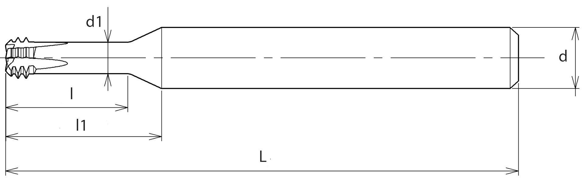 | Einsatz: | auf CNC-Maschinen für Durchgangs- und Sacklochgewinde in Guss und gehärtetem Stahl bis 65 HRC |