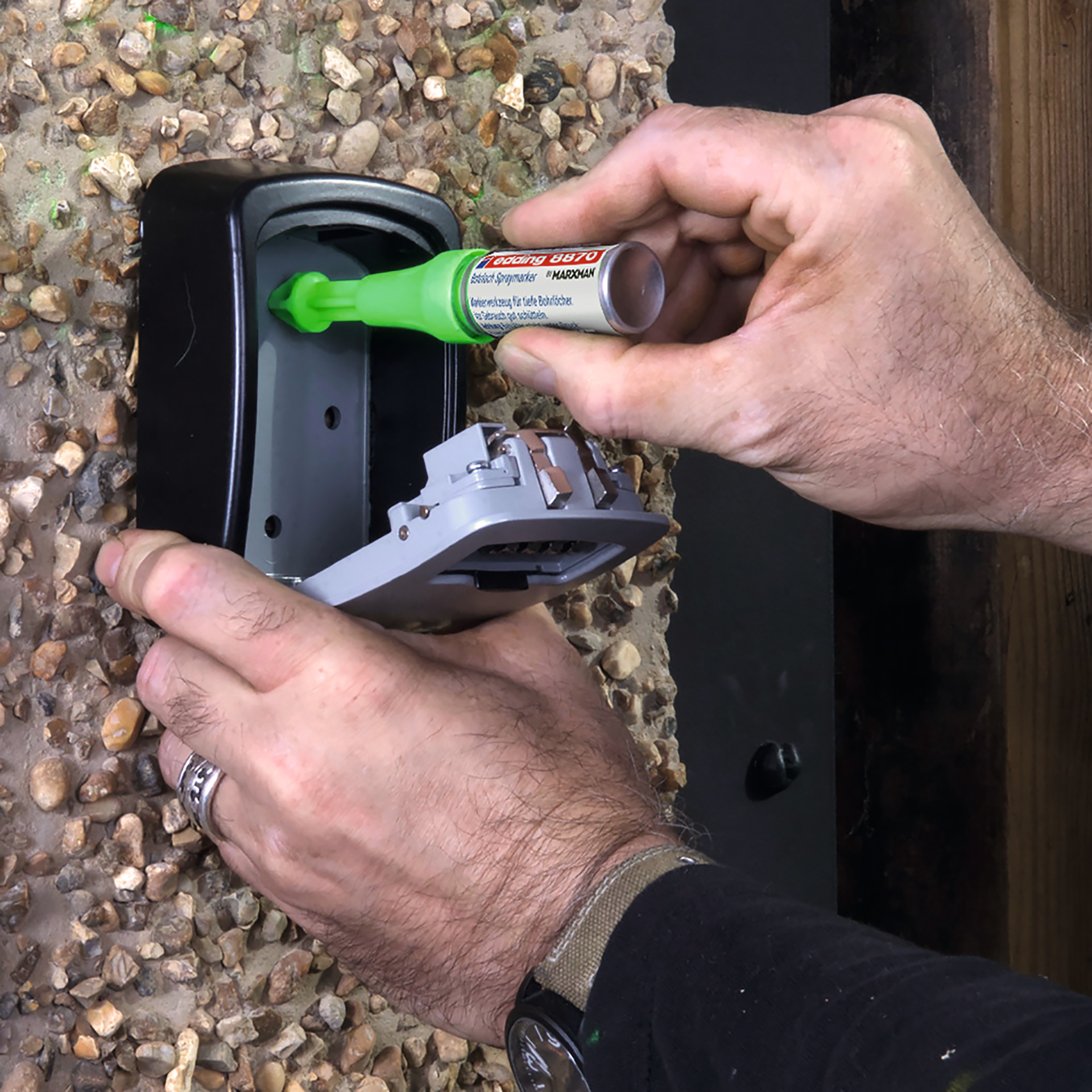 | Einsatz: | zum Markieren an schwer zugänglichen Stellen auf fast allen Oberflächen wie z. B. Beton, Fliesen, Metall, Holz, Aluminium, Edelstahl, Kunststoff, Fugenmörtel, Stein, Porenbeton, Zement, Granit, Gipsputz |