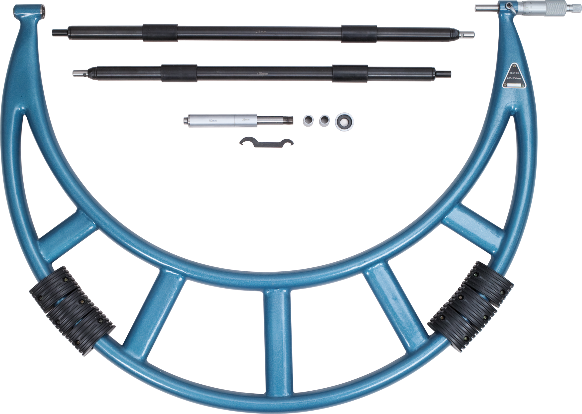 auswechselbarer Amboss, hartmetallbestückte Messflächen, bis Messbereich 300 mm mit Spindeldurchmesser 6,5 mm, 8,0 mm ab Messbereich 300 mm, Ratsche, Klemmhebel, Handwärmeschutz, Lieferung in Bügelausführung (Grauguss) bis Messbereich 200-300 mm, ab Messbereich 300-400 mm erfolgt die Lieferung in geschweißter Stahlrohrausführung, Lieferung bis Messbereich 1000 mm als Eyltool-Ausführung, ab Messbereich 1000 mm Lieferung als Helios-Preisser Ausführung
