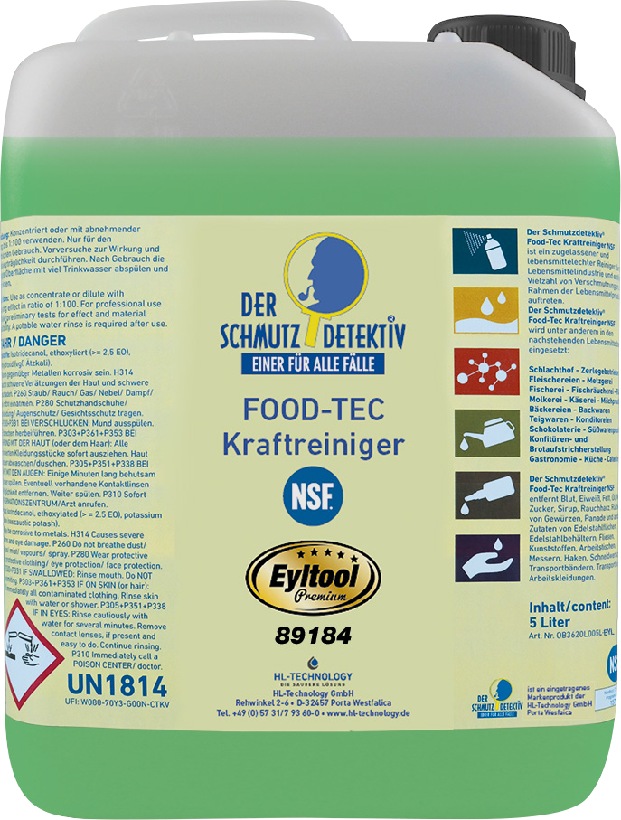 | Einsatz: | zur Entfernung von Verschmutzungen wie Öl, Fett, Rauchharz, Eiweiß, Blut, Sirup usw. von Oberflächen aus Edelstahl, Kunststoff und Keramik z. B. Messer, Schneidwerkzeug, Transportbänder und -kisten u.v.m. in allen Bereichen der Lebensmittelverarbeitun |