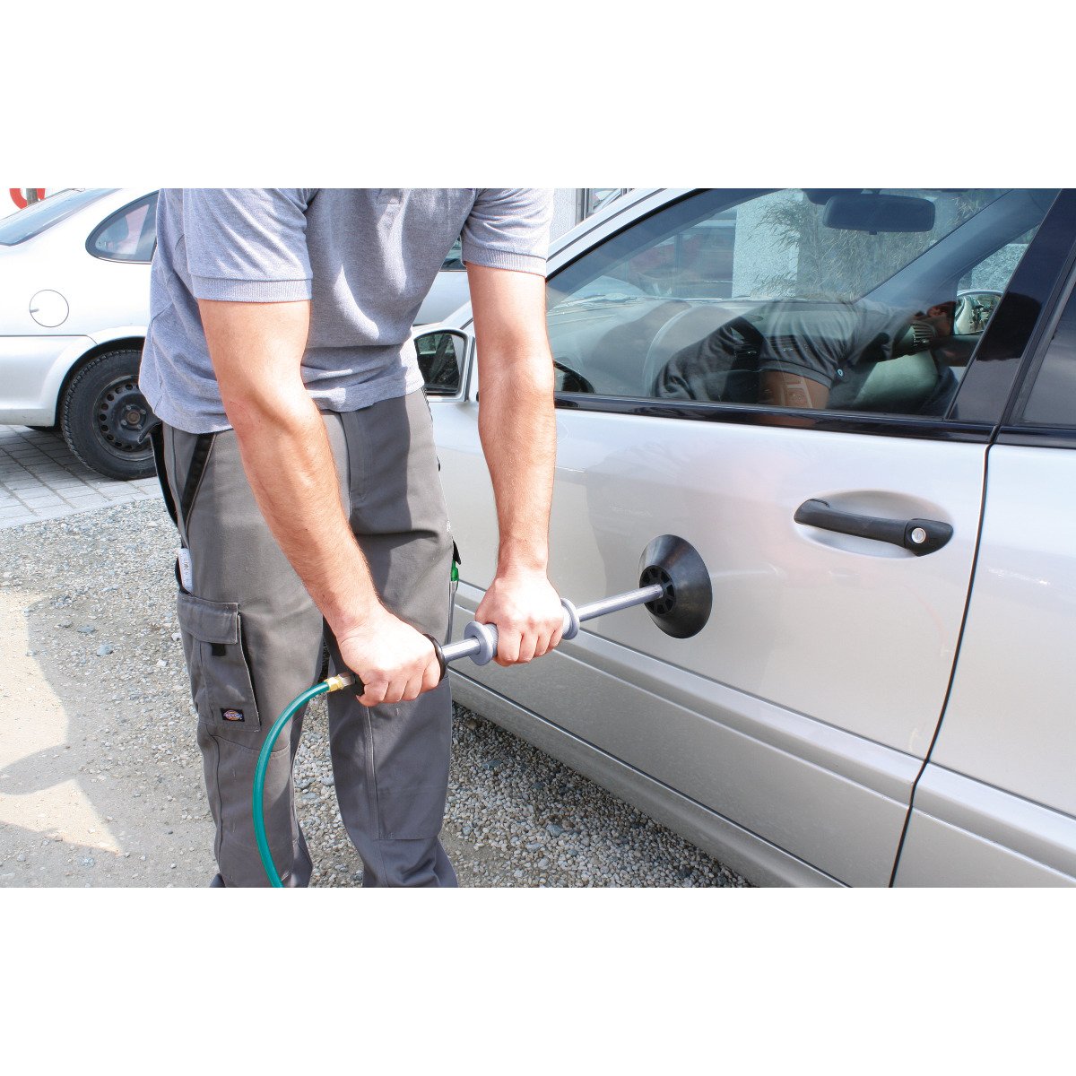 - Ansaugung an der Karosserie durch Unterdruck nach Anschluss an Duckluftsystem