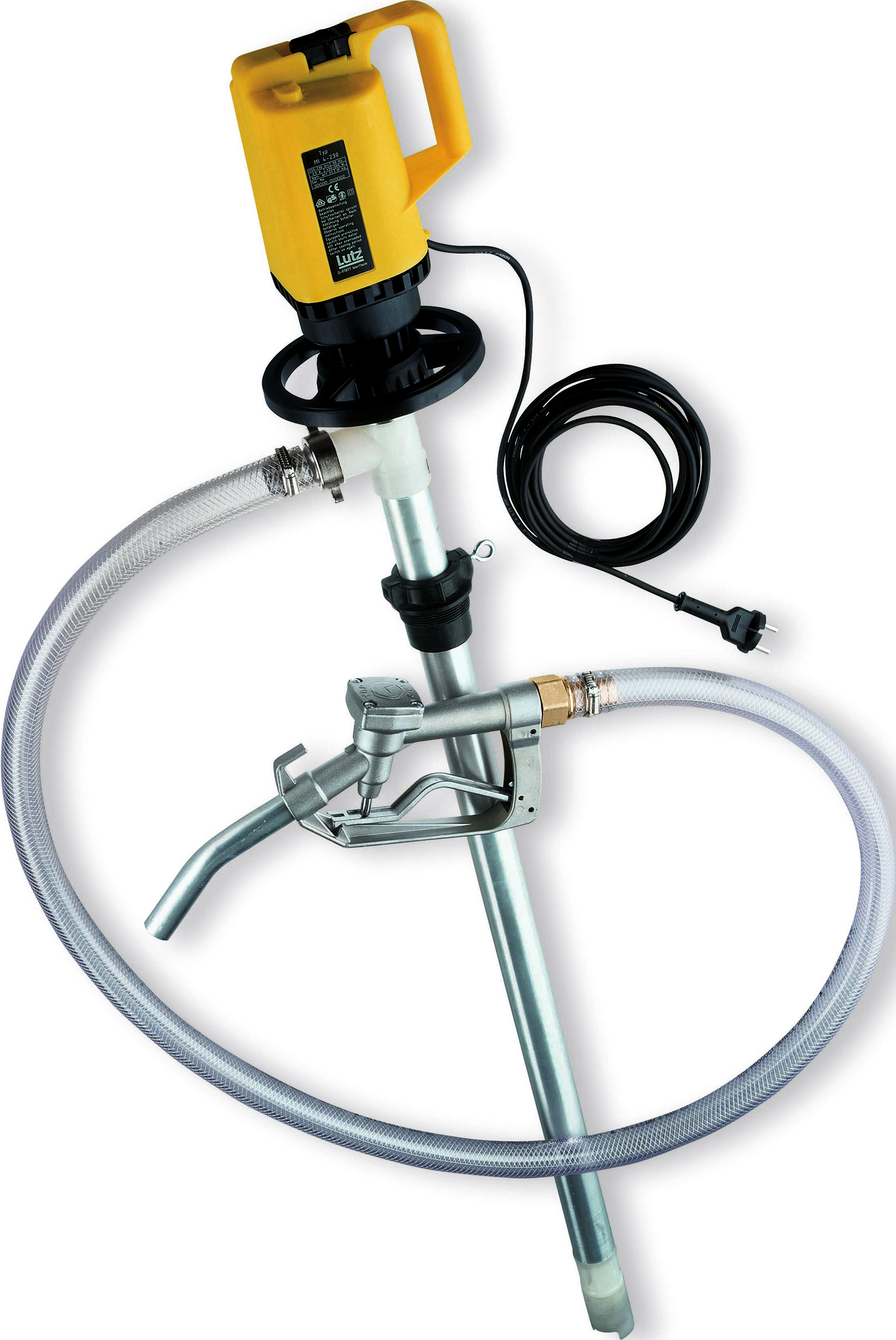 Motor, Pumpwerk aus Aluminium mit Welle aus Edelstahl, 2 m PVC-Gewebeschlauch 1" und Schlauchanschlüsse, Alu-Zapfpistole, Schlauchschellen, PP-Fassadapter
