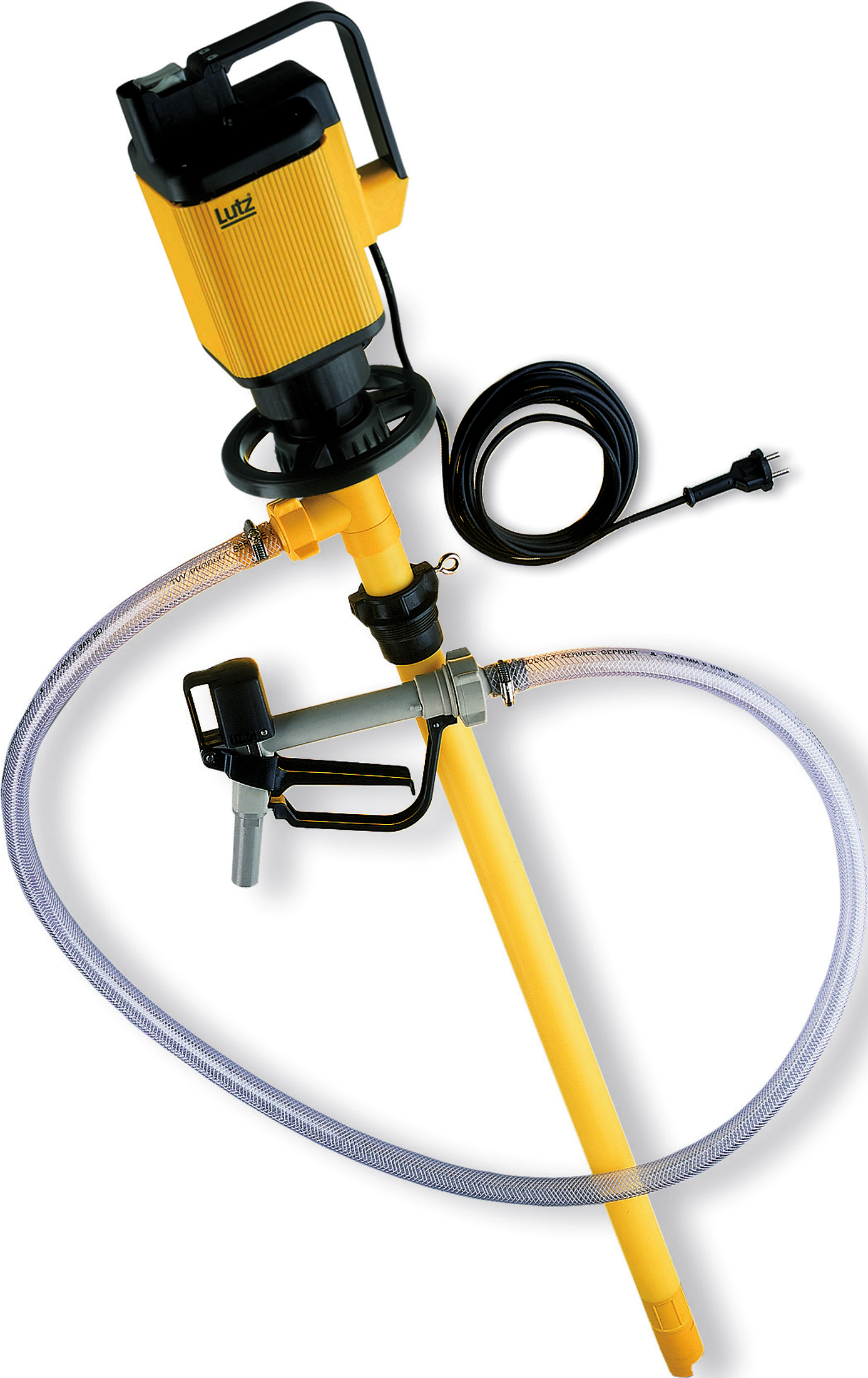 Motor, Pumpwerk aus Polypropylen mit Welle aus Hastelloy-C, 2 m PVC-Gewebeschlauch 3/4" und Schlauchanschlüsse, PP-Zapfpistole, Schlauchschellen, PP-Fassadapter