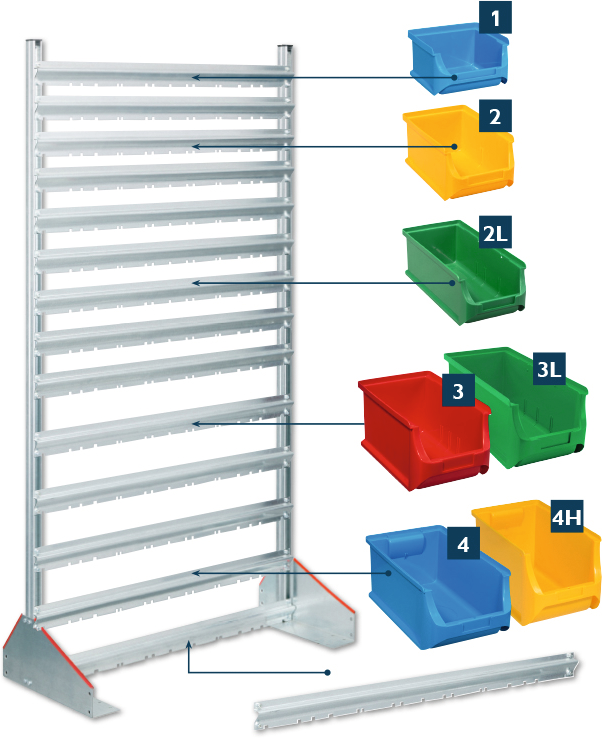 - zweiseitige Ausführung: Regaleinheit und 2 Grundschienen