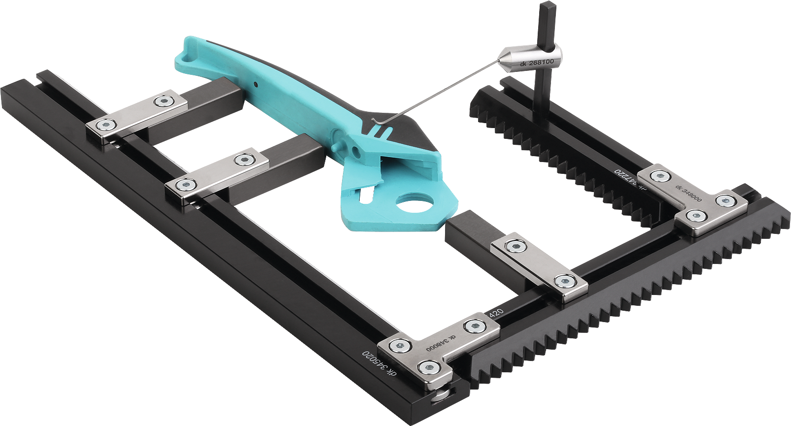 Grundschiene 450 mm, Anschlussschiene 100 mm, Anschlussschiene 200 mm, 2 Schienen-Verbindungsstücke, 3 Aufspannpratzen 45 mm (M4-M6), je 1 Federspanner links und rechts 34 mm, je 1 Federspanner links und rechts 50 mm, 4 Aufnahmen für Federspanner 20 mm, je 3 (M4, M5, M6)
