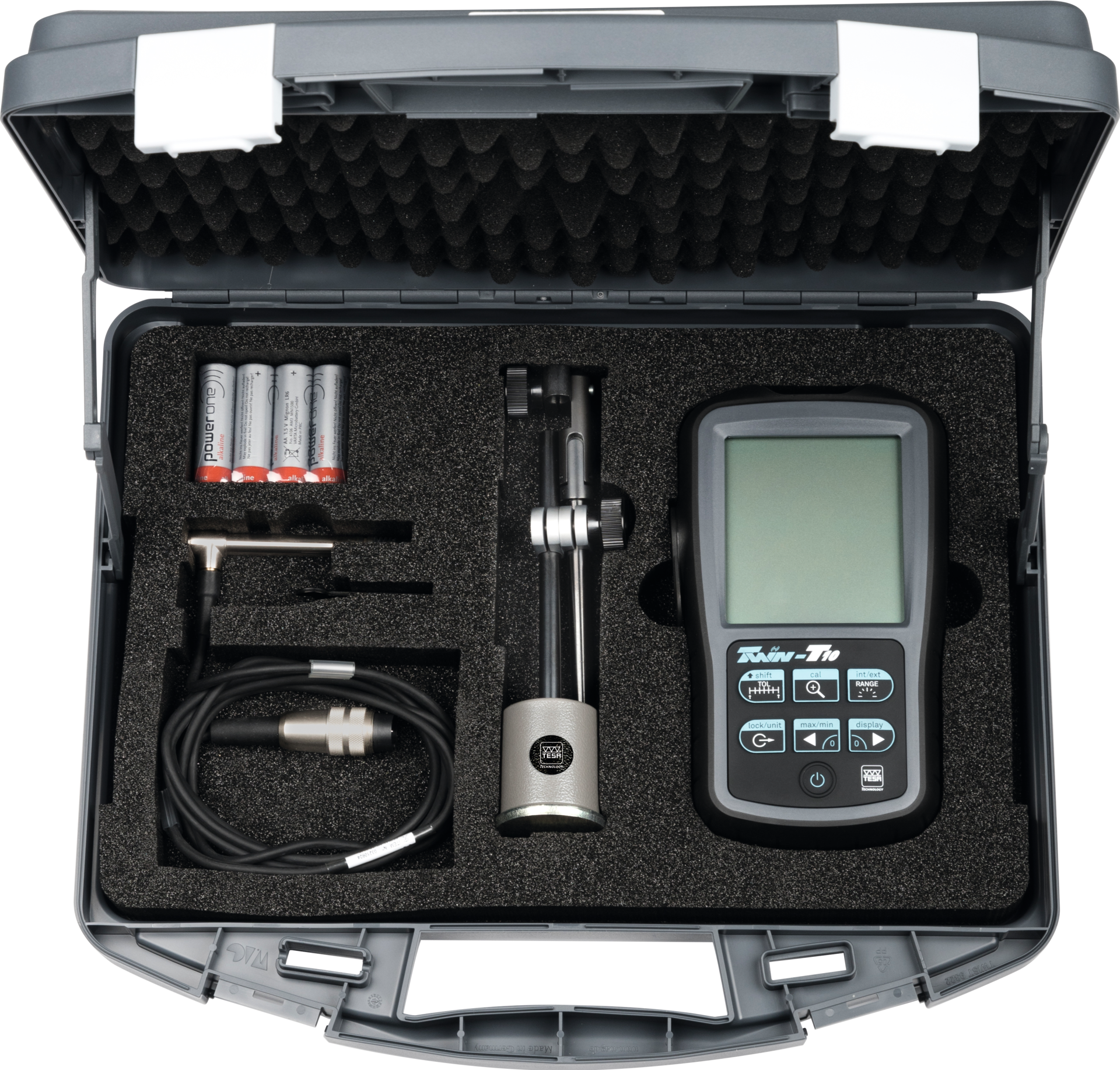 Anzeigegerät (Art.-Nr. 33950), Längenmesstaster, Verbindungskabel, Magnetmessstativ und 4 Mignon-Batterien