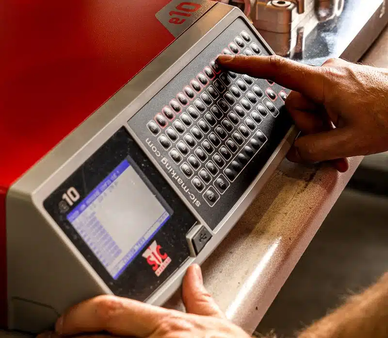 Schrifthöhe einstellbar von 0,5-25 mm, Punktmatrix (5 x 7 und 9 x 13 Punkte pro Zeichen, variabel einstellbare Punktabstände von 0,05-1,0 mm), geradlinige bzw. Kreis-, Winkel- und mehrzeilige Beschriftung, invertierte und Spiegelschrift, verschiedene Schriftarten (OCR, OCR-A, Arial und Courier), Seriennummern auf- und absteigend, Zeitvariablen, Schichten, Data Matrix Kennzeichnugn (ECC200), Prägen von Logos (PC-Software zur Logoerstellung gesondert erhältlich), Vorschau und Simulation der Prägung, bis zu 2000 Prägedateien programmierbar, Aufruf von 63 programmierten Dateien BCD codiert, serielle Kommunikation im ASCII-, Text- und Binär-Protokoll