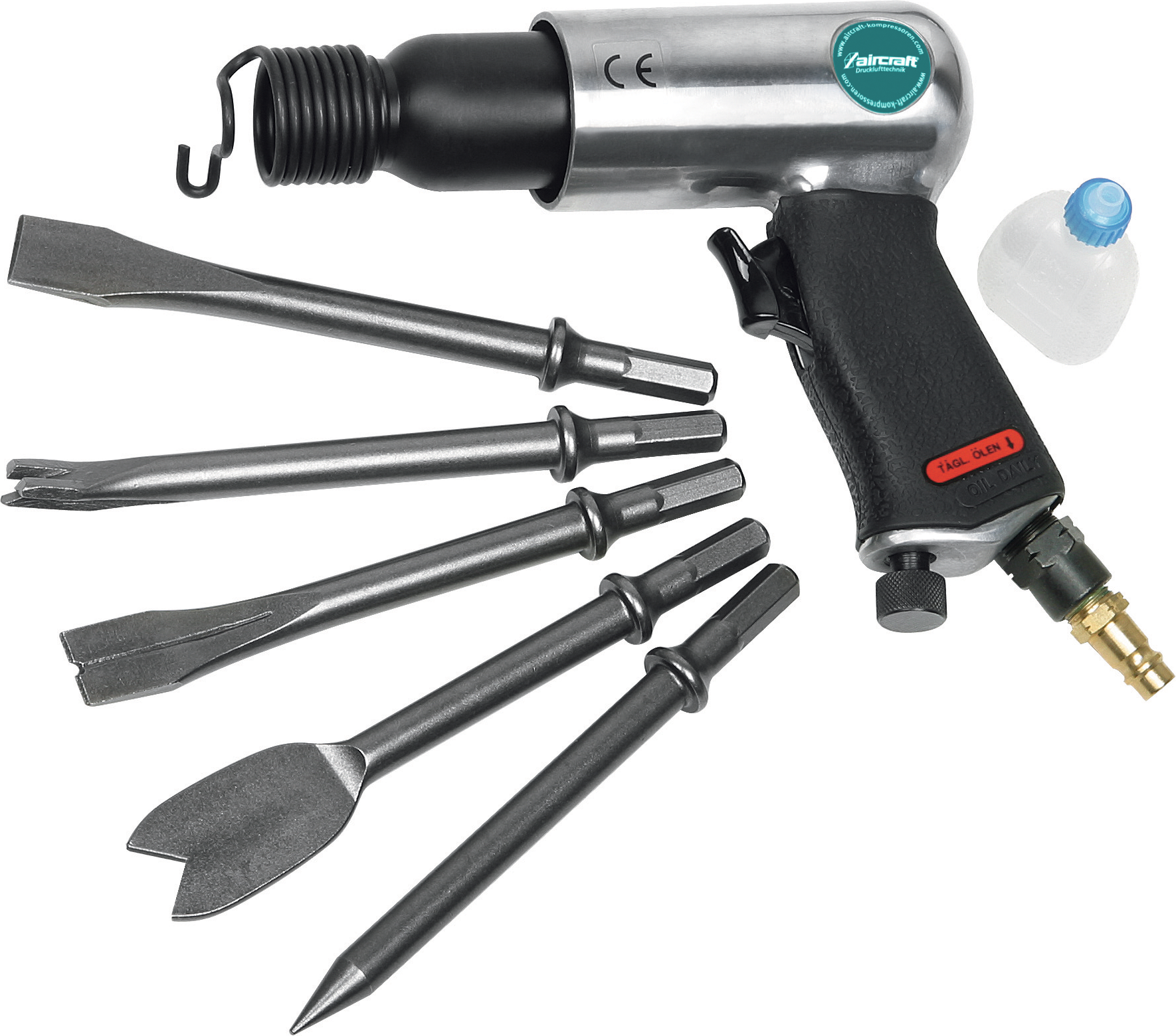 Flachmeißel, Spitzmeißel, Blechschneidmeißel, Bolzenmeißel, Schnellspannfeder, 1 Flasche Öl, Kupplungsnippel und Kunststoffkoffer