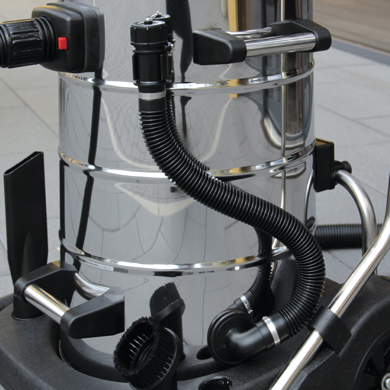 komplett antistatisch, Entleerung wahlweise per Knickschlauch oder Kippfunktion, Zyklonwasserabscheidesystem, stufenlose Leistungsregulierung, Ausblasfunktion, Zweistufenschaltung (Economy und Turbo), stabile Metall-Lenkrollen und gummierte Räder