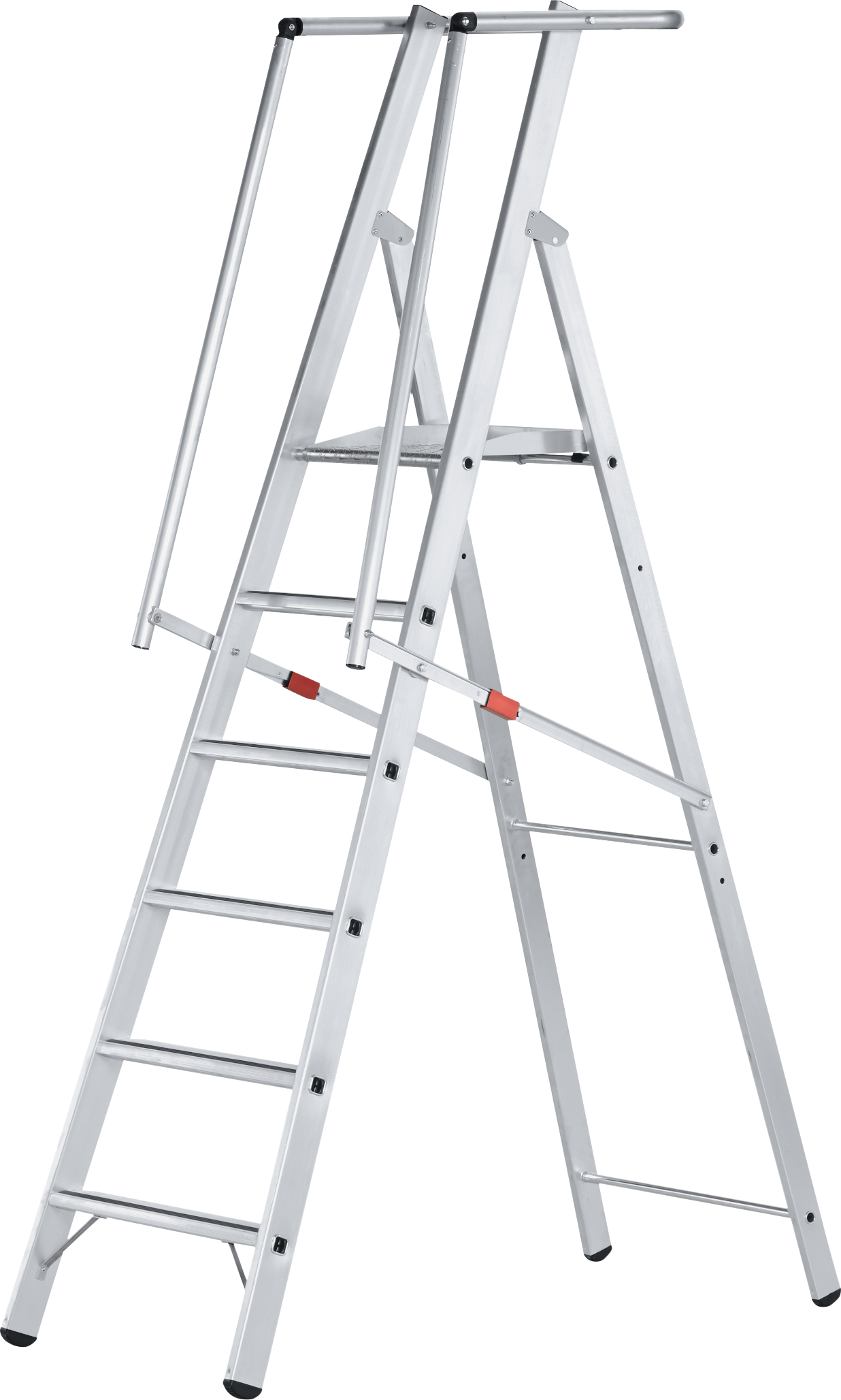 klappbar, Standfläche mit Aluminium-Riffelblech, Haltebügelhöhe 1000 mm, mit Ablageschale aus Aluminium, serienmäßig mit 2 Handläufen, Stufen mit Safer Step Technology, Stufen und Holme aus Aluminium-Strangpessprofilen, Spreizsicherung durch Perlongurte ab 5 Stufen