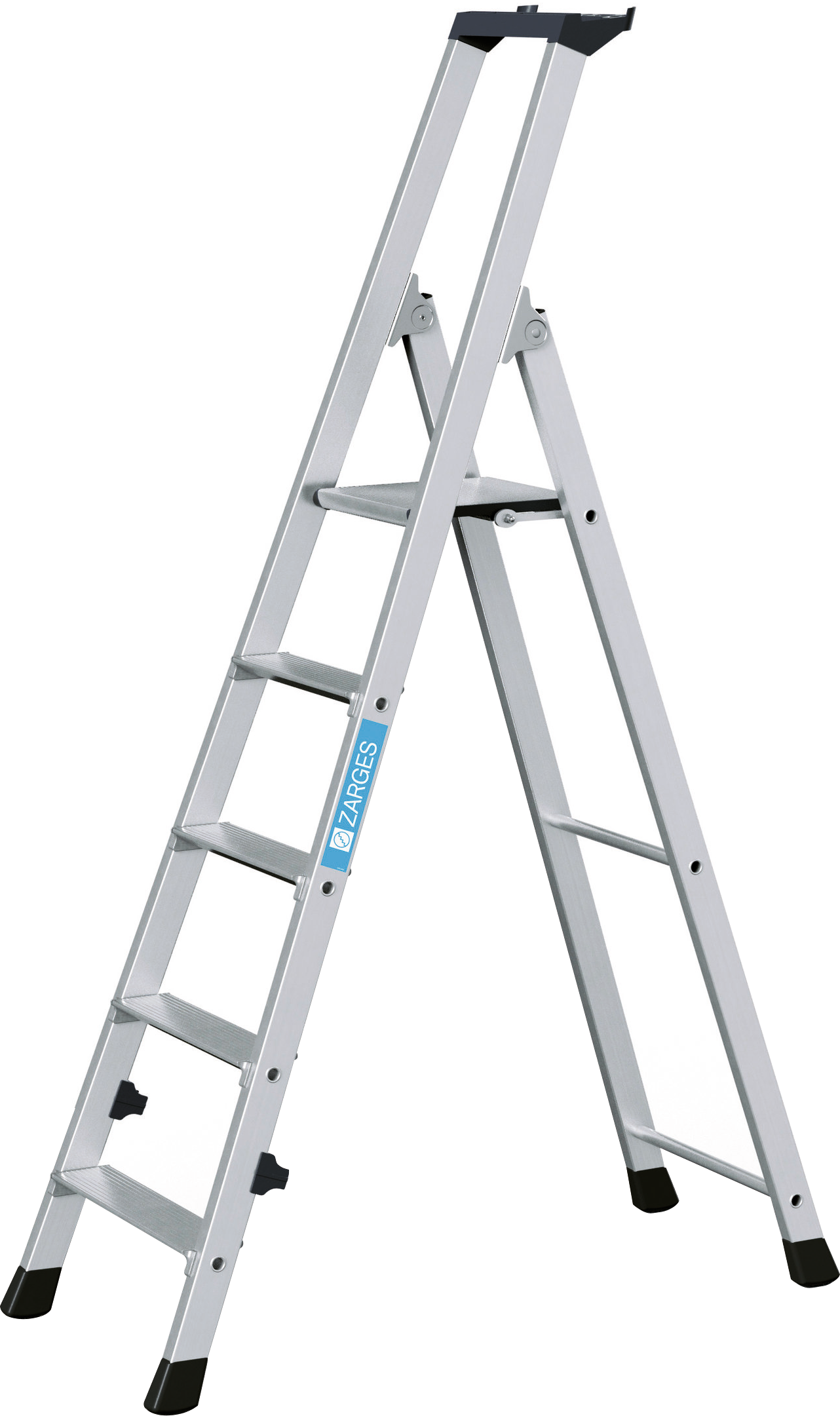 einseitig begehbar, Plattform mit rutschsicherer Riffelung, Stufen-Holm-Verbindung durch Qualitätsbördelung, Ablageschale aus Aluminium, Stufen und Holme aus Aluminium-Strangpressprofilen, Spreizsicherung durch Perlongurte ab 5 Stufen