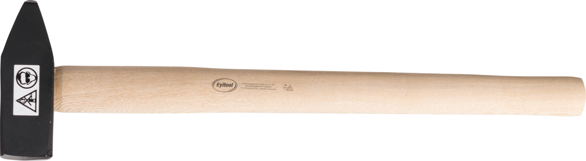 geschmiedeter Hammerkopf, durch Ringkeil und Sicherungsplatte sowie Holzschraube werden Hammerkopf und Holzstiel zu einer Einheit, Hickorystiel mit zusätzlicher langer Stahl-Stielschutzhülse, patentierte Stielbefestigung, hohe Sicherheit, lange Lebensdauer