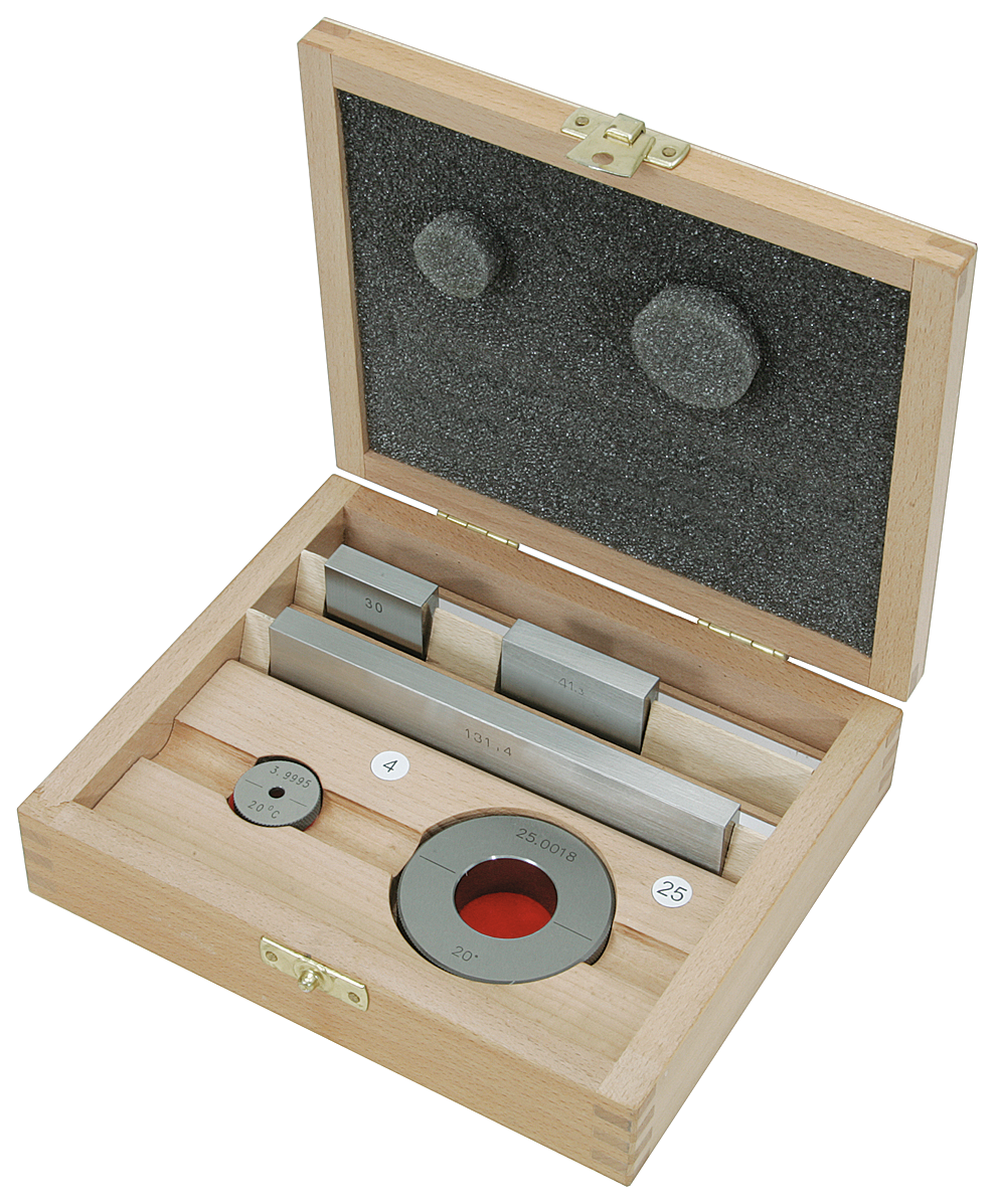 aus hochwertigem, speziell legiertem und entspanntem Spezialstahl, hohe Stabilität und gute Anhaftbarkeit, sorgfältig gehärtet und handgeläpptLieferumfang:je 1 Endmaß 41,3, 131,4 und 243,5 mm, je 1 Einstellring Ø 4,0 und Ø 25,0 mm im Holzetui