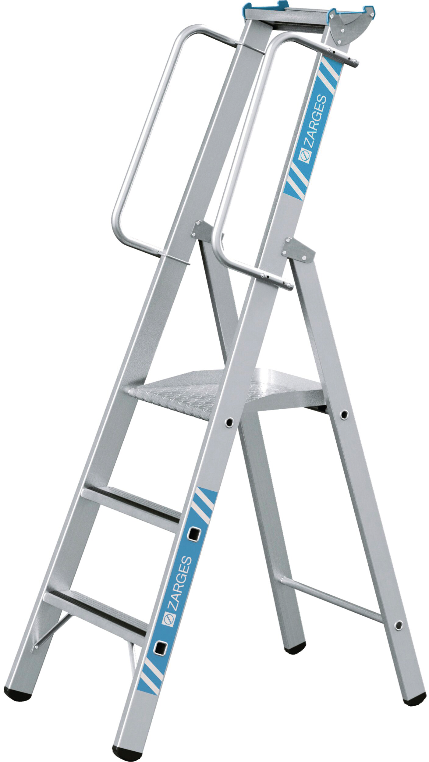 klappbar, Standfläche mit Aluminium-Riffelblech, Haltebügelhöhe 1000 mm, mit Ablageschale aus Aluminium, serienmäßig mit 2 Handläufen, Stufen mit Safer Step Technology, Stufen und Holme aus Aluminium-Strangpessprofilen, Spreizsicherung durch Perlongurte ab 5 Stufen
