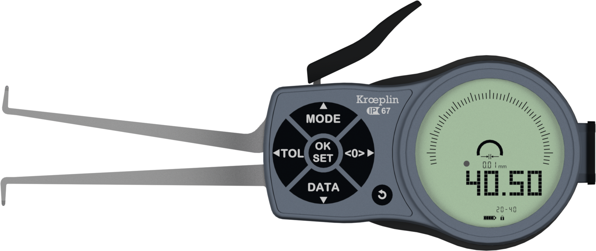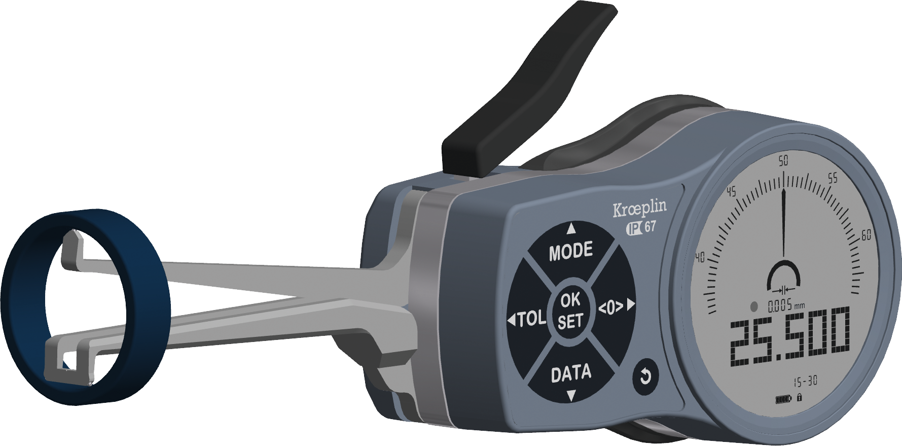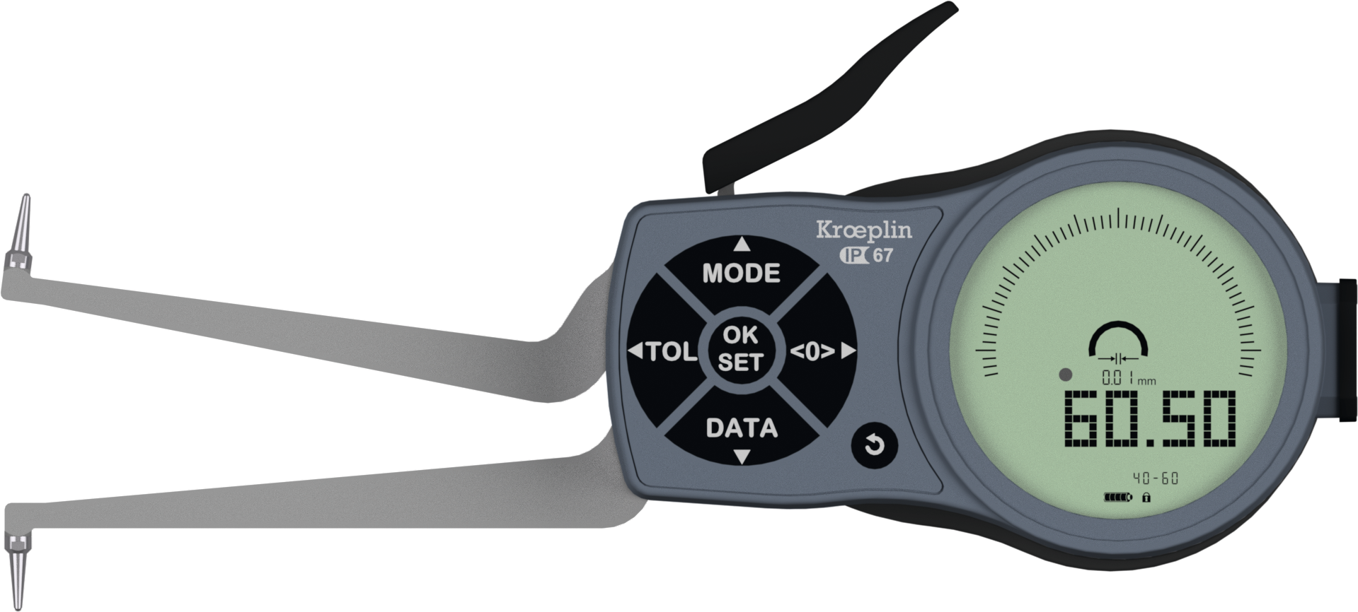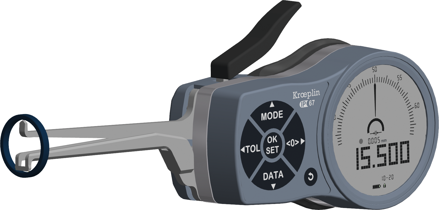 Elektronische Funktionen: EIN/AUS, mm/inch, Nullstellung an jeder Stelle, ABS/REL, TOL, MIN, MAX, HOLD, Messwertspeicher für 100 Messwerte