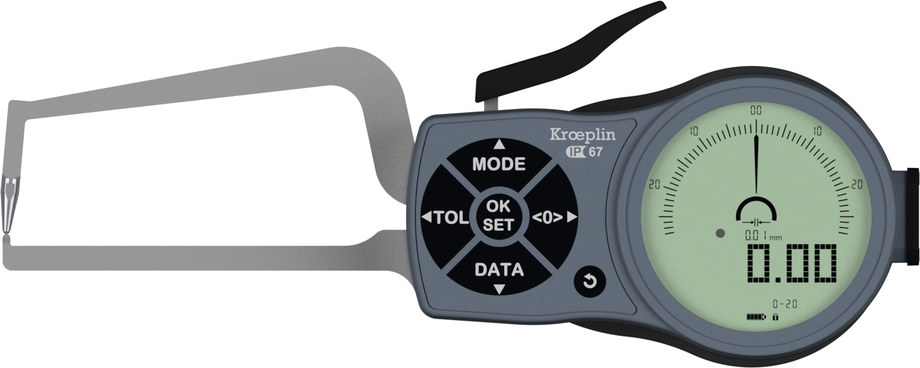 kombinierte Digital- und Skalenanzeige, Rot-Grün-Anzeige bei Toleranzmessung, Tastatur mit Touchoberfläche und Vibrationsfeedback, intuitive Menüführung, Analoganzeigebereich 250°