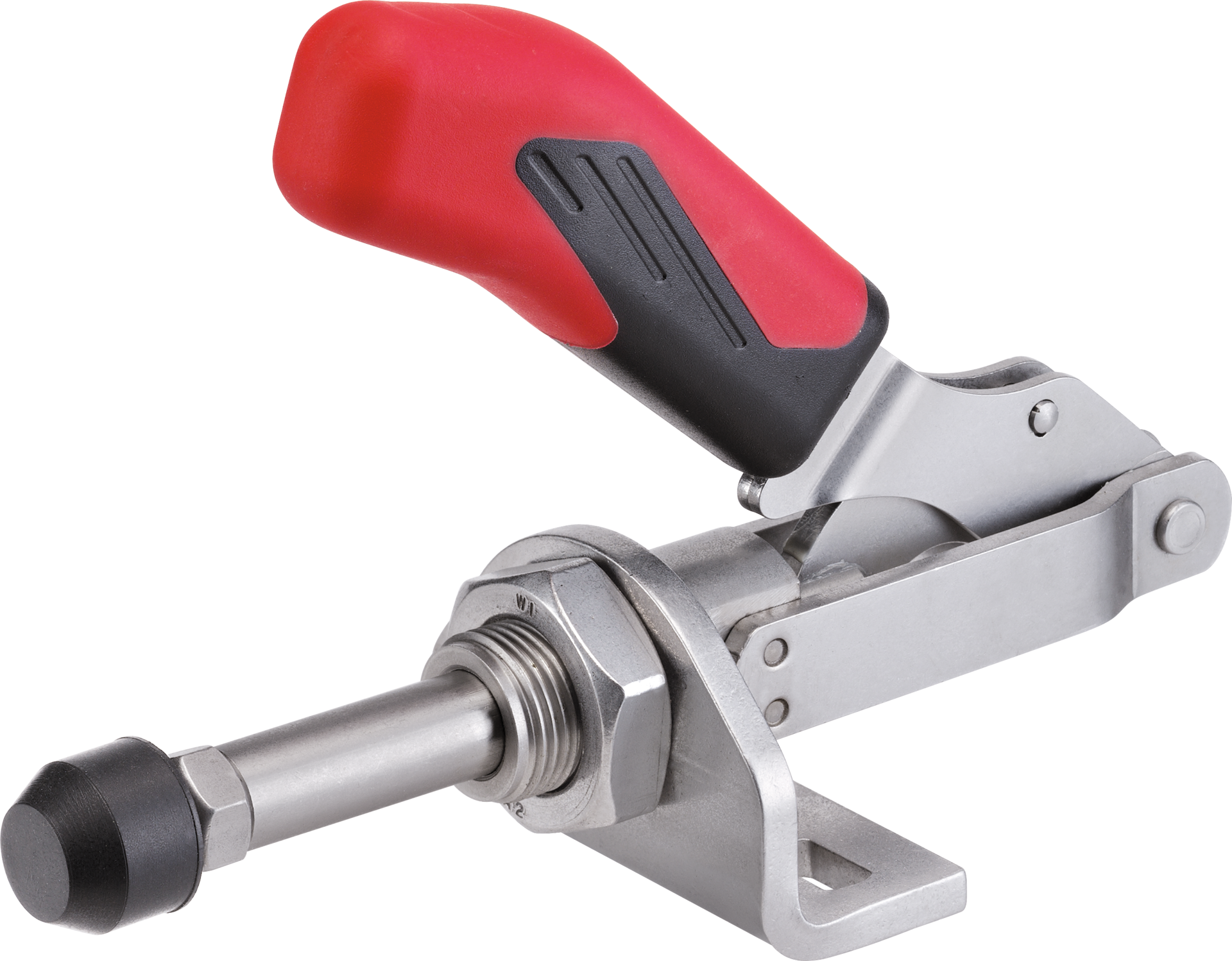 Schubstange und Handhebel gleichlaufend, Druck- und Zugspanner, lange Schubstangenführung mit Befestigungsgewinde und Mutter, verzinkt und passiviert, Nieten aus rostfreiem Stahl, die bei Größe 2 und Größe 3 in einsatzgehärteten Lagerbuchsen laufen, Hebeteile und Schubstange aus Vergütungsstahl, Lagerstellen gefettet, Handgriff aus rotem und ölbeständigem Kunststoff, Handhebel in beliebiger Winkelstellung zur Grundfläche drehbar, mit großer Handauflage und weicher Komponente