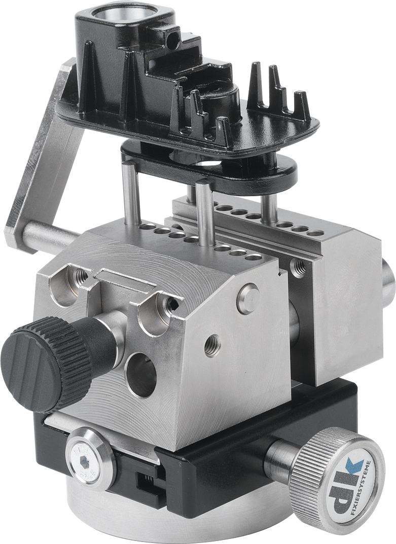 abgesetzte Backen und Bohrungen für Stiftklemmung ( Ø 4 mm), austauschbare Führungssäulen zur Spannbereichs-Erweiterung bis 75 mm, mit Schnellwechseladapter SWA39