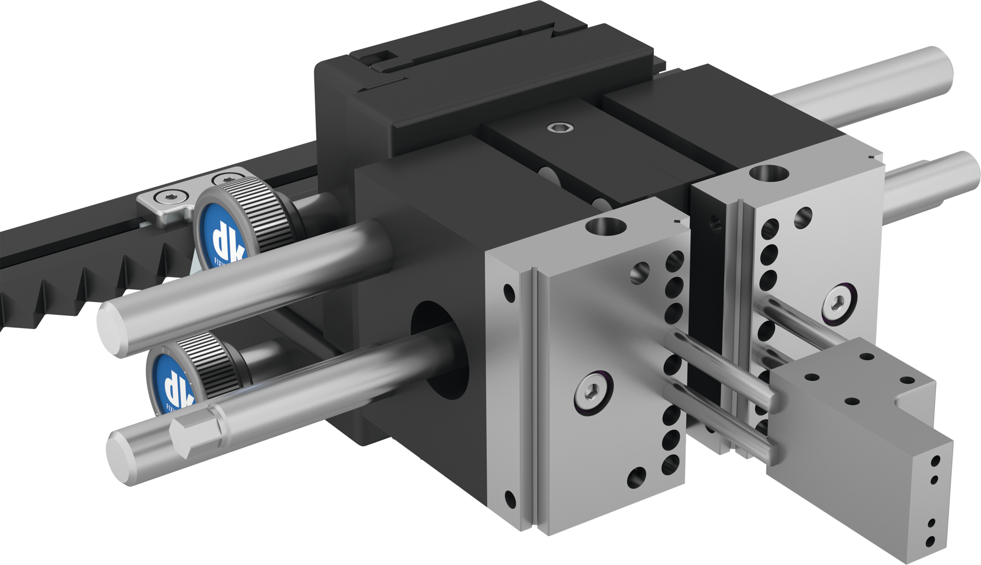 zentrisch spannend, mit abgesetzten Backen und Adaptionsmöglichkeit für viele Zubehörelemente, Bohrungen zum Einsatz von Stiften für die erhöhte Positionierung von Teilen, damit diese allseitig zugänglich sind, mit Schnellwechseladapter SWA39, der um 90° versetzt montiert werden kann