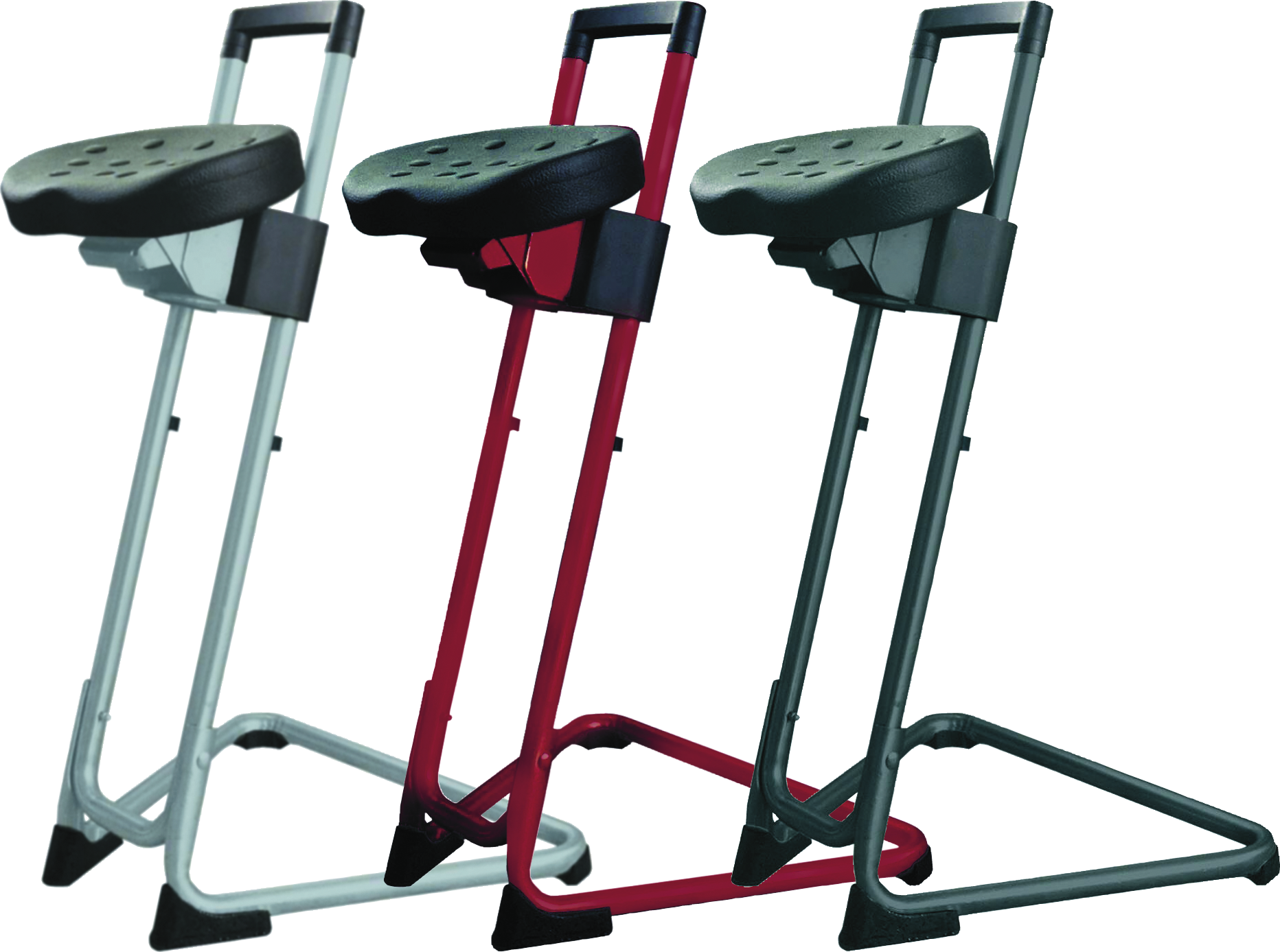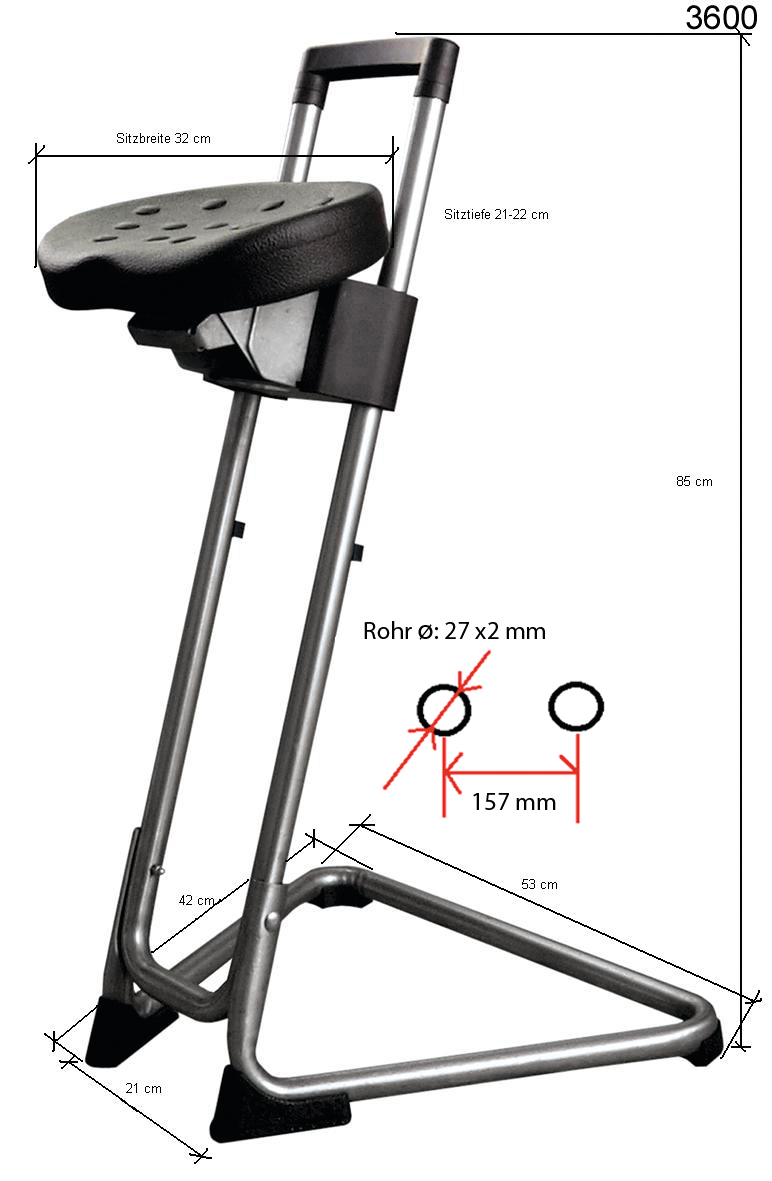 Stahlrohrgestell, Sitz aus Integralschaum, Sitzneigeverstellung 15°, horizontal 16° schwenkbar, rutschfeste Bodengleiter, Fußbreite 530 mm, Fußtiefe 420 mm, Sitz mit Rückstellautomatik, belastbar bis 120 kg, GS-geprüft