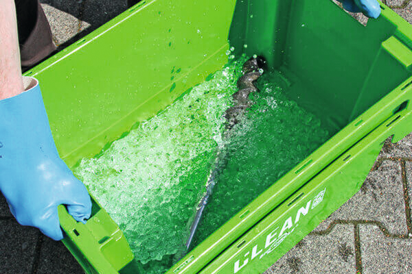 stapelbar und platzsparend, aus Kunststoff, durch Handgriffe für den Transport geeignet, die Reinigungsflüssigkeit zum Entfernen von Verschmutzungen kann mehrfach genutzt werden, da der Reiniger mithilfe des durchbrochenen Tauchkorbes beim Herausheben zurück in die Tauchbox fließt, die Oberflächen der Box-Innenseiten sind glatt, wodurch das Reinigungsmittel bei Bedarf schnell gewechselt und das System einfach gesäubert werden kann
