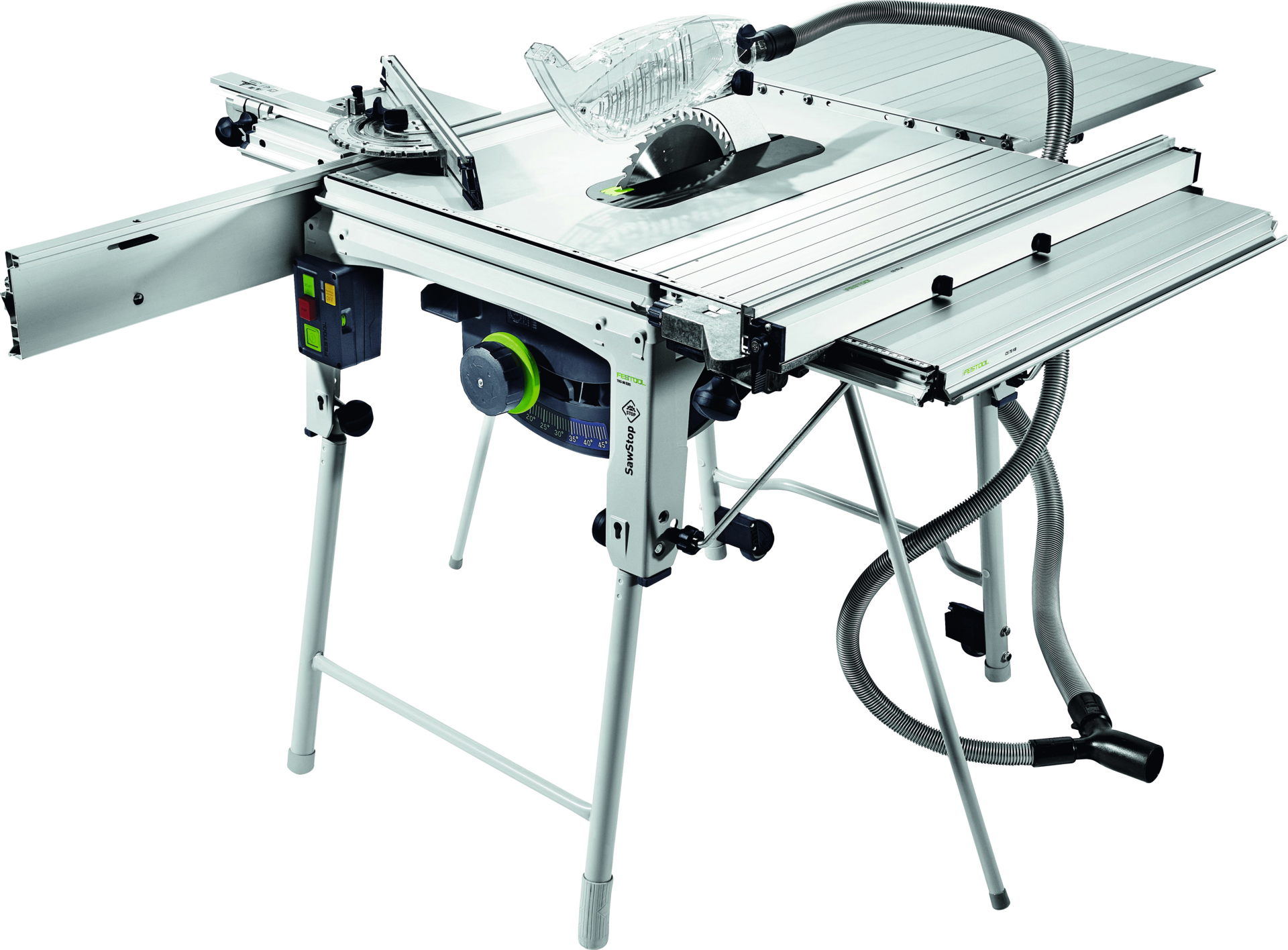 Saw-Stop-Technologie stoppt das Sägeblatt innerhalb von 5 Millisekunden und verschwindet unter der Arbeitsfläche, sicheres Sägen von nichtleitendem Material, Saw-Stop kann bei Bedarf deaktiviert werden, seitlich angebrachte Werkzeuggarage für Sägeblatt, Patrone und Schiebestock, durch Splitterschutz ist ausrissarmes Sägen möglich, Neigungswinkel -2° bis 47° (links), Absaugstutzen 27/36 mm