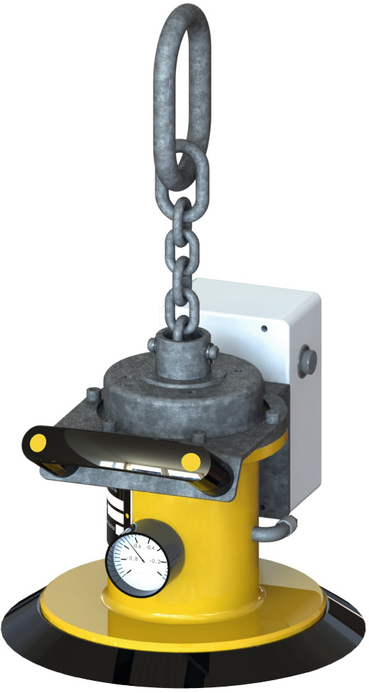 energieunabhängig, Gerät wird in Lastrichtung abgesetzt, mittels Kolben im Inneren entsteht beim Anziehen ein Unterdruck und die Last kann gehoben werden, bei der Lastablage wird der Kranhaken soweit abgesenkt bis eine automatische Umschaltung erfolgt und die Last freigegeben wird, eine optische und akustische Warneinrichtung meldet etwaigen Druckverlust