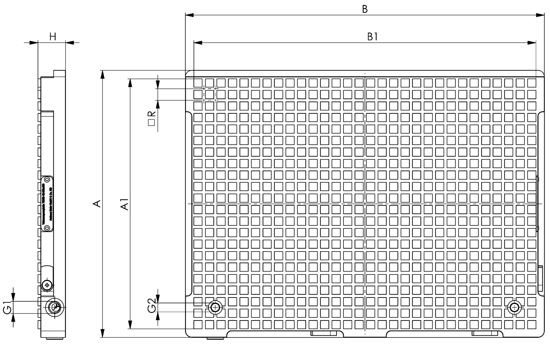 die Vakuumplatte hat auf der Oberseite Nuten und Ansaugstellen, durch das Einlegen der Dichtschnur können ein oder mehrere Felder für die gewünschte Werkstückgröße festgelegt werden, einfache Positionierung durch seitliche Exzenteranschläge, mit seitlichem Spannrand zur Befestigung der Vakuumspannplatte auf einer Grundplatte, nachträgliche Bohrungen für ZPS K10 (M8) sind möglich, Maß G1 = G1/4", Maß G2 = G1/8"