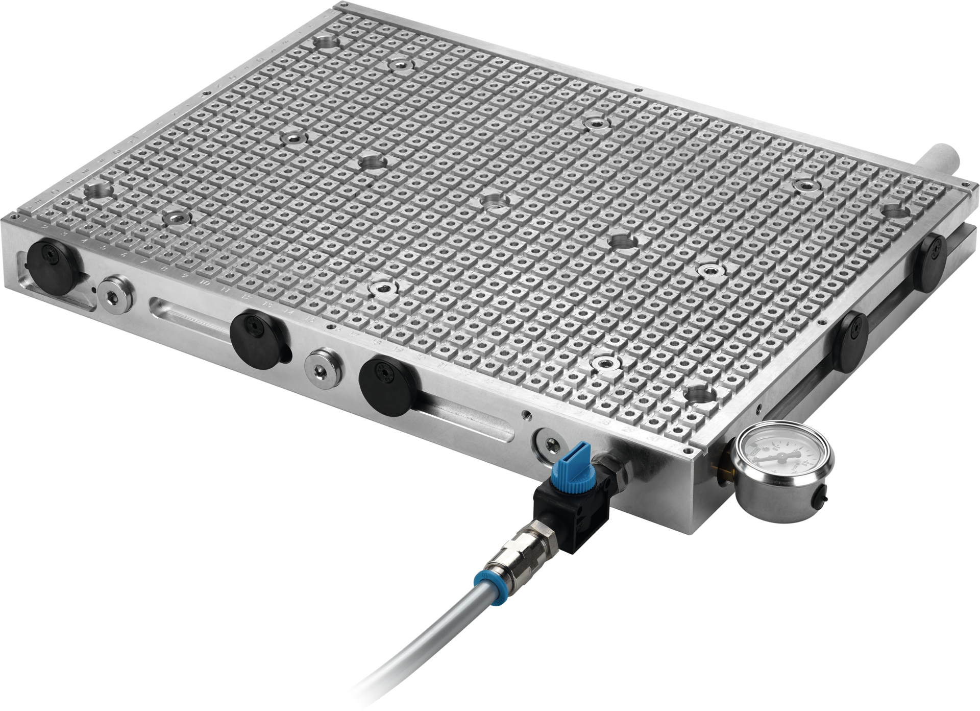 die Vakuumplatte hat auf der Oberseite Nuten und Ansaugstellen, durch das Einlegen der Dichtschnur können ein oder mehrere Felder für die gewünschte Werkstückgröße festgelegt werden, einfache Positionierung durch Bohrungen für Anschlagstifte oder durch seitliche, höhenverstellbare Exzenteranschläge, seitliche Nuten bzw. Befestigungsbohrungen (für M8) zur Befestigung der Vakuumspannplatte auf einer Grundplatte, durch die vorhandenen Aufnahmebohrungen kann die Platte in das AMF-Nullpunktspannsystem Größe K20 (M12) integriert werden