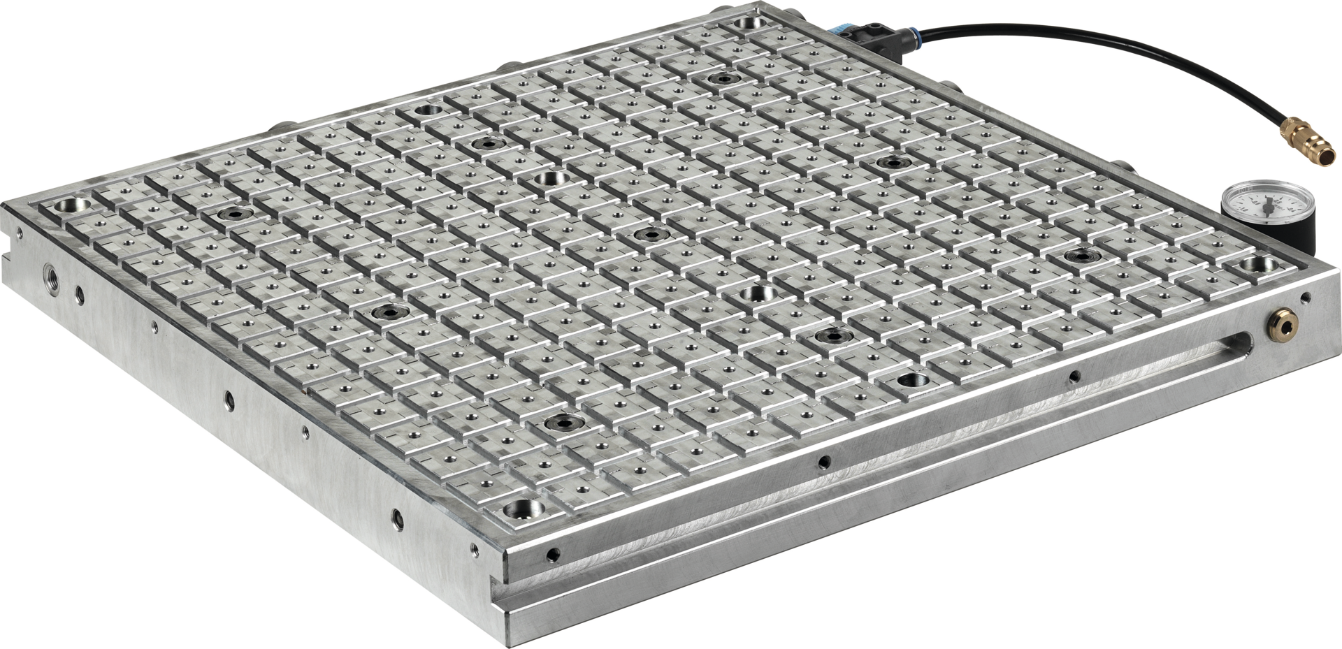 die Vakuumplatte hat auf der Oberseite Nuten und Ansaugstellen, durch das Einlegen der Dichtschnur können ein oder mehrere Felder für die gewünschte Werkstückgröße festgelegt werden, alle Ansaugstellen sind miteinander verbunden, einfache Positionierung durch Bohrungen für Anschlagstifte oder durch seitliche, höhenverstellbare Exzenteranschläge