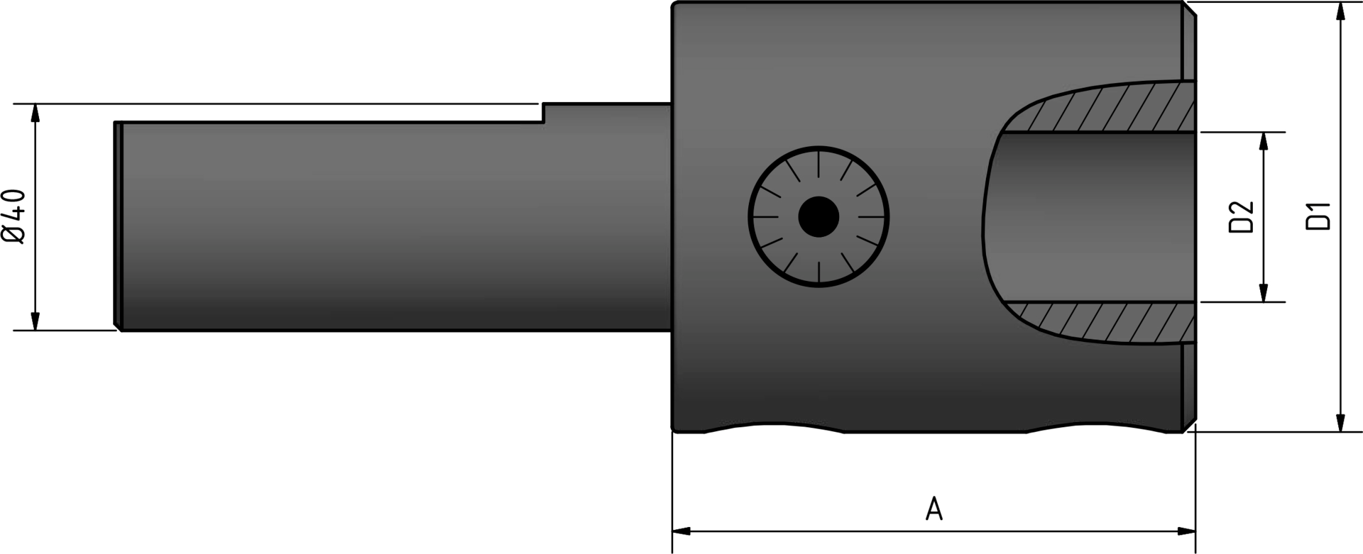 zur Aufnahme von Wendeplatten-Vollbohrern mit Zylinderschaft (Schaftdurchmesser 20 bis 40 mm), sehr großer Verstellbereich: -0,6 bis 2,4 mm im Durchmesser (abhängig vom Vollbohrer-Typ), z. B. Bohrerdurchmesser 22 mm auf min. 21,7 mm / max. 24,4 mm verstellbar, Feinverstellung: 0,01 mm pro Teilstrich im Durchmesser!