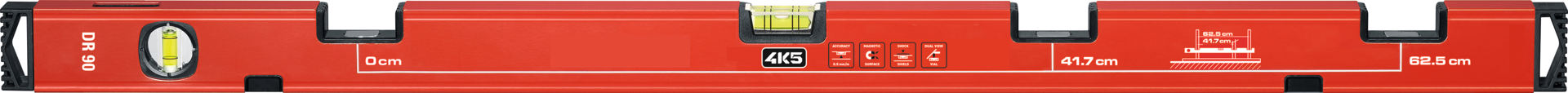 gefräste Sohle, tonnenförmige Horizontal- und Vertikallibelle aus Plexiglas, Horizontallibelle mit 2 %-Gefällemarkierung, gummierte Endkappen (schlagfest), Einschnitte mit Seltenerdmagneten für das einfache Fixieren, Justieren und Installieren von Metall-Wandprofil~41,7, 62,5, 40
