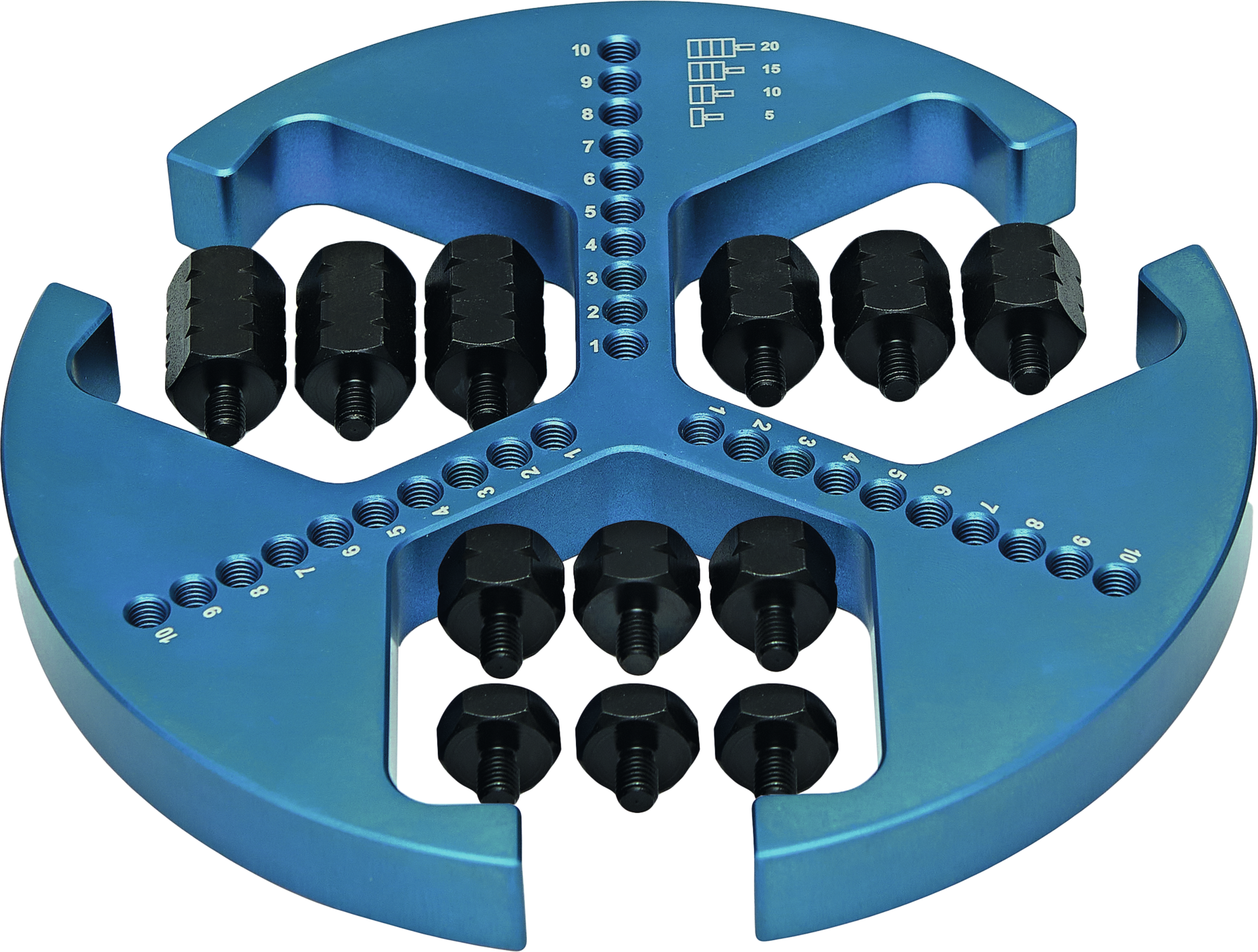 Werkstückanschlag mit je 3 Stehbolzen mit 5 mm, 10 mm, 15 mm und 20 mm