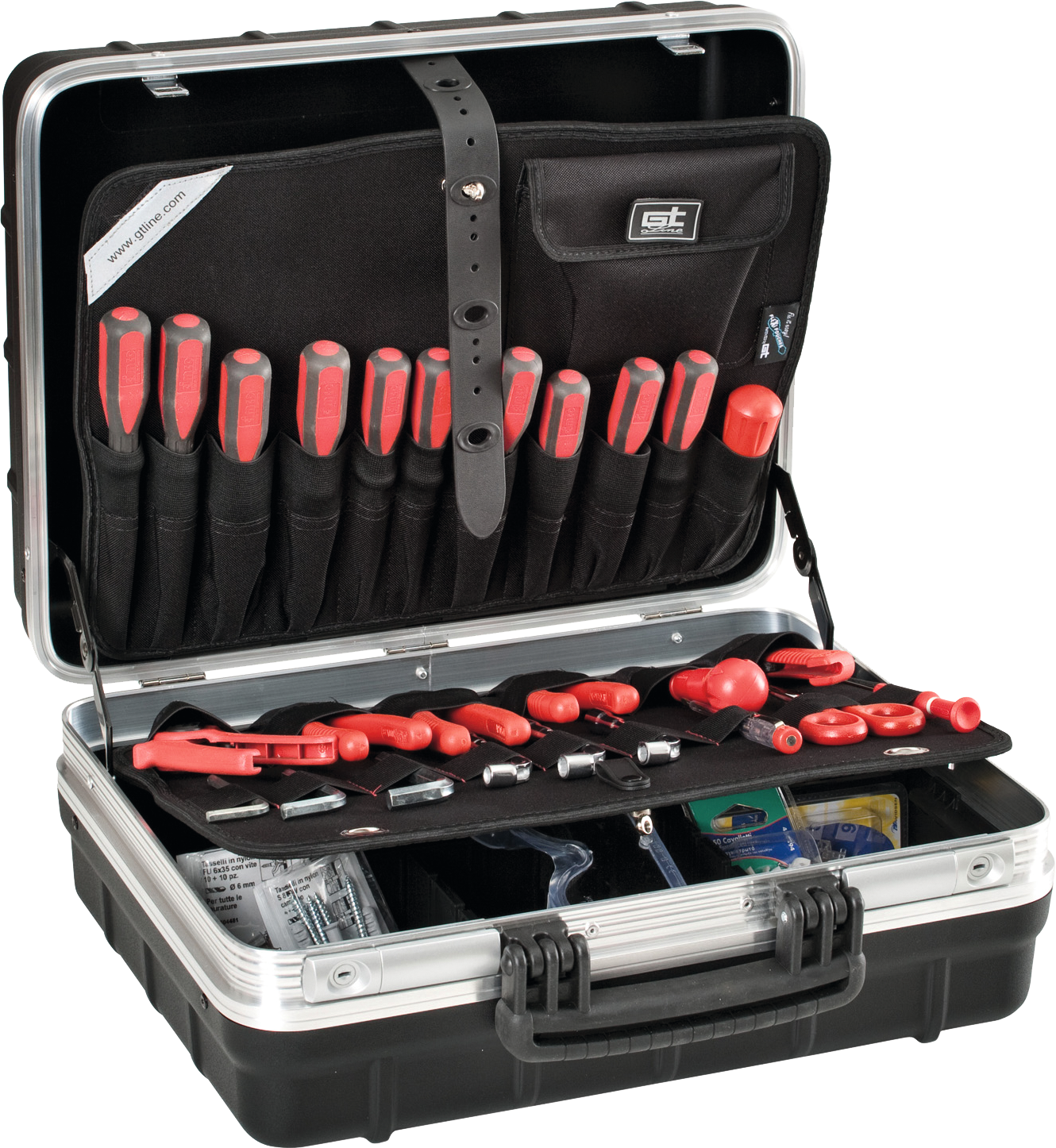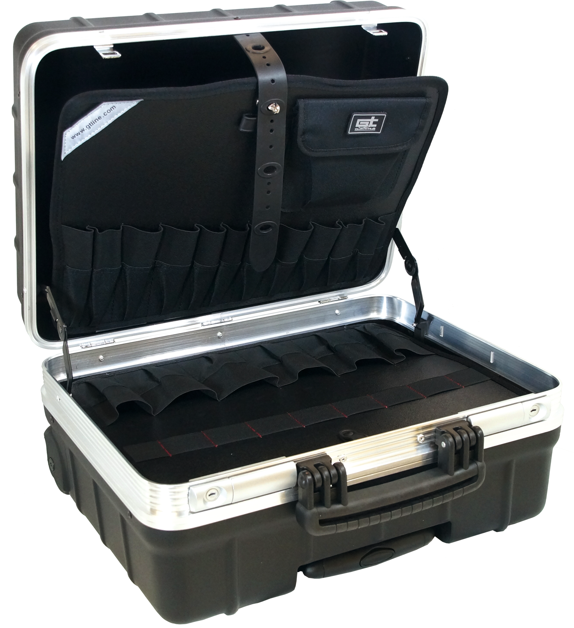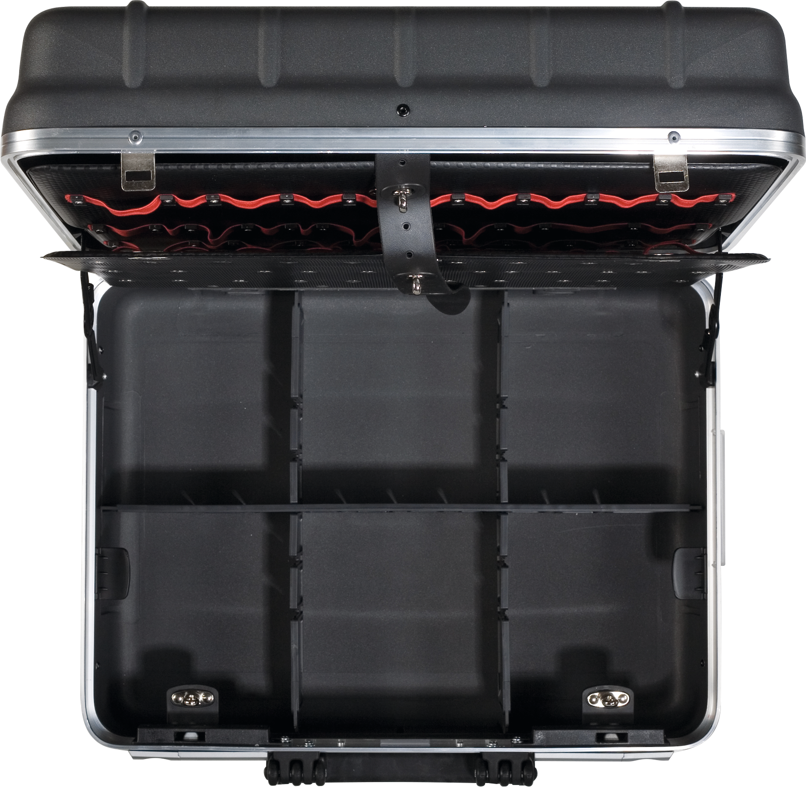 umlaufender Alu-Rahmen, Werkzeugtafeln sind herausnehmbar, Tragegriff, Metallscharniere